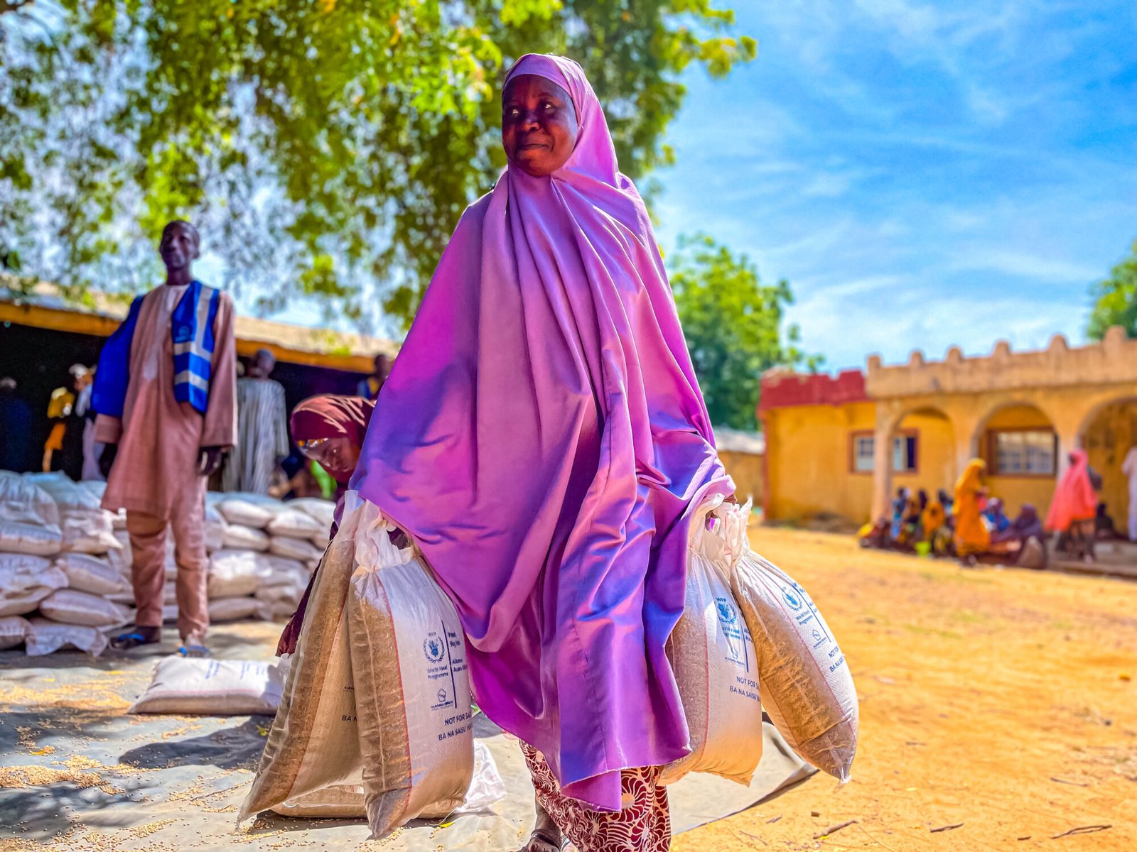 With a heart full of gratitude, Zainab Abdullahi heads home carrying her wheat ration, a…