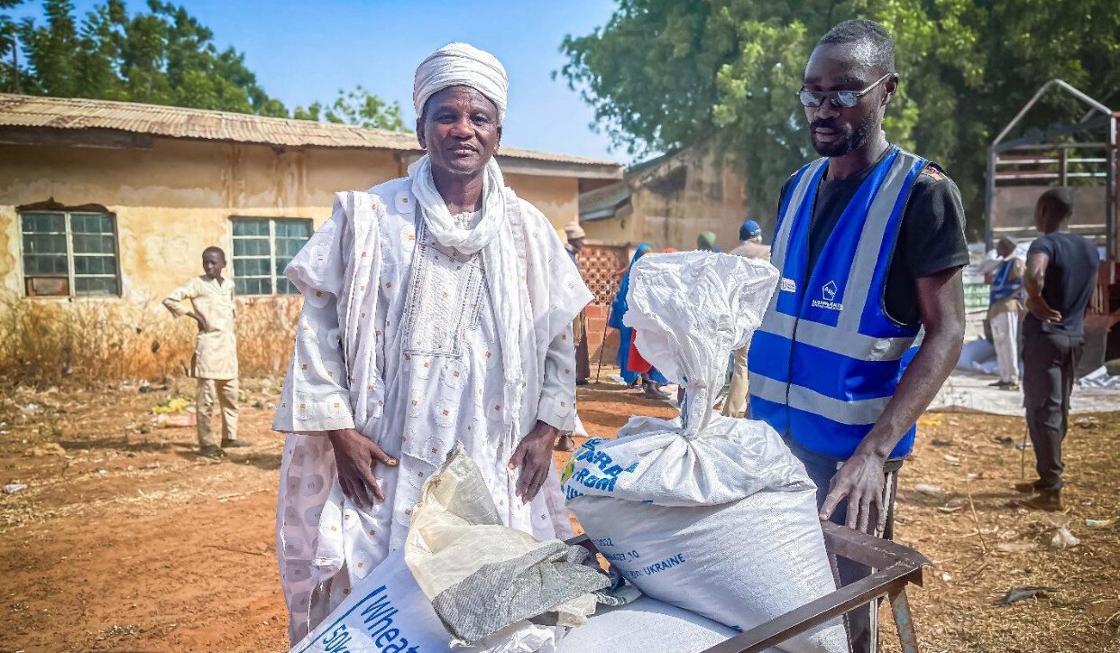 Chief Imam Abubakar Salau beams with gratitude as he receives sacks of Ukraine wheat during…